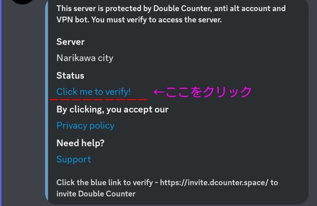 サーバーに参加するとDouble CounterからDMがきます。認証するには「Click me to verify!」をクリックしてください。